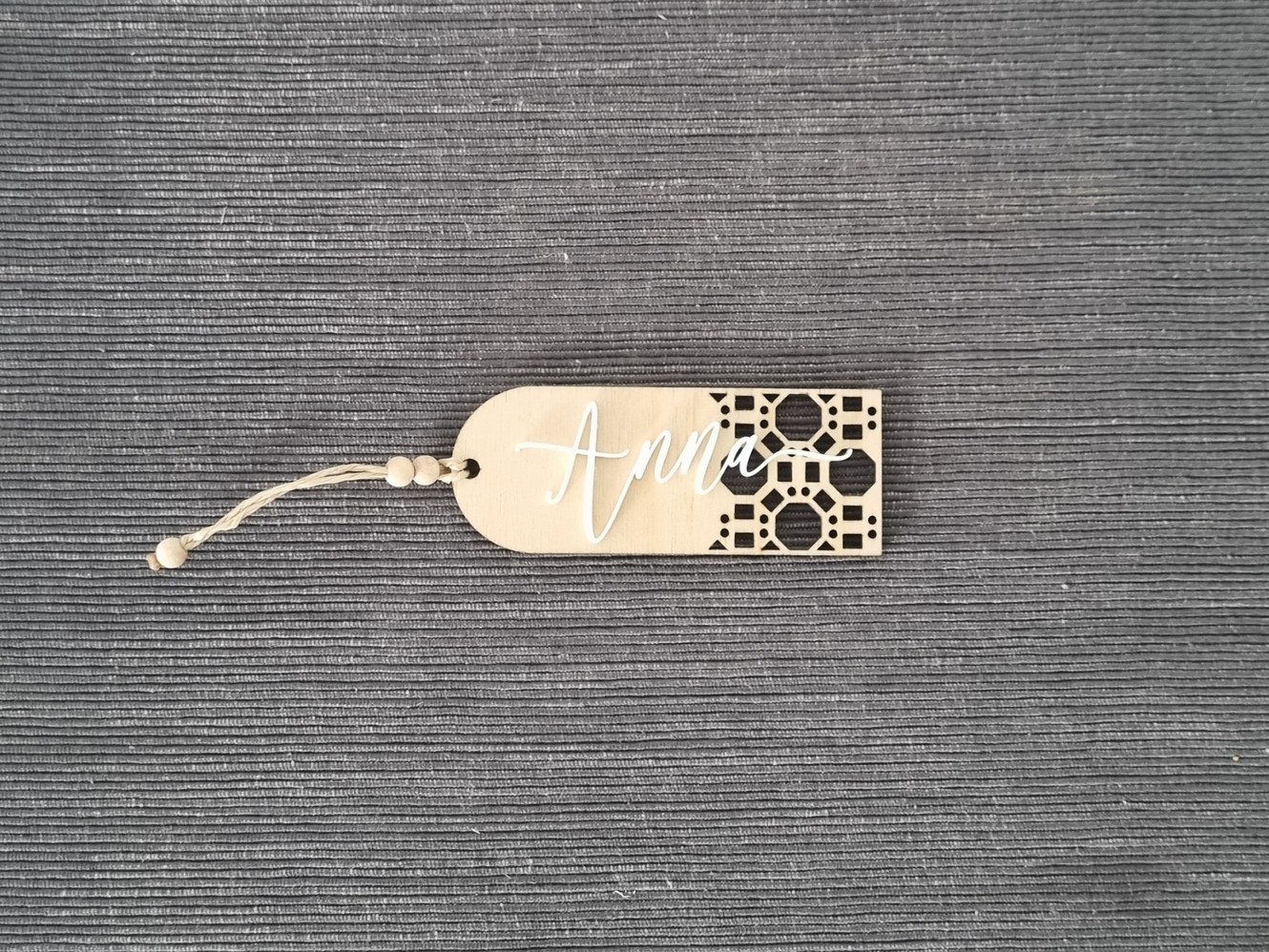 A wooden card with the name of the guest