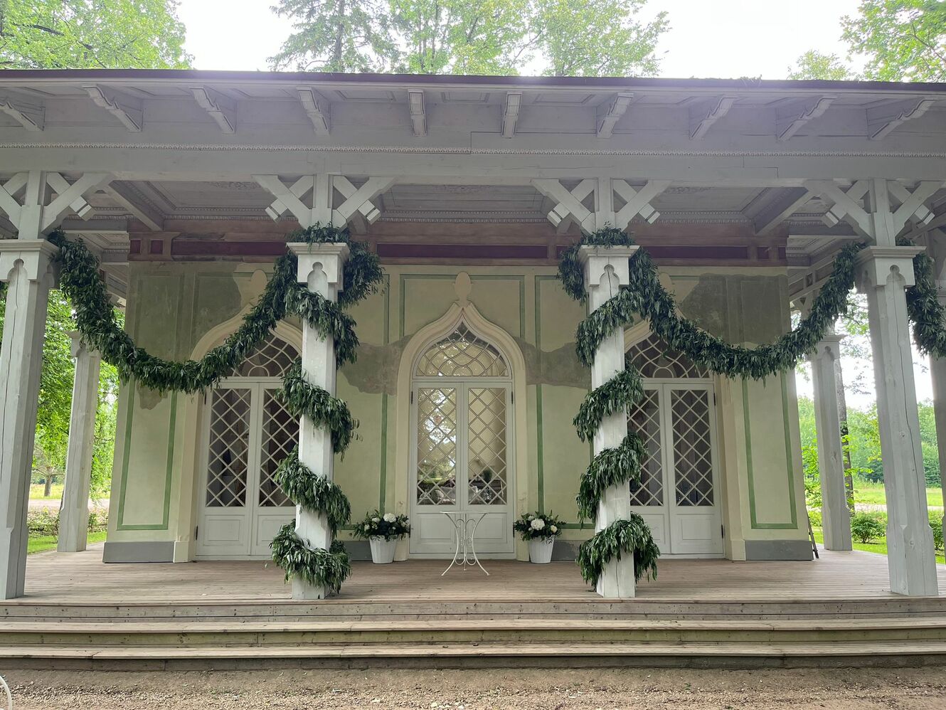 Gaišie, mežģīnēm līdzīgie kokgriezumi namiņa terases rotājumos rada neatkārtojamu atmosfēru tiem, kas vienu no sava mūža skaistākajām dienām izvēlas pavadīt tieši šeit, sakot "jā" vārdu, malkojot šampanieti un uzsmaidot tiem, kas ieradušies mīlestību svinēt kopā ar viņiem.